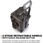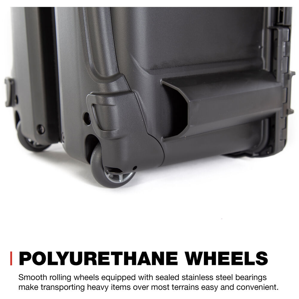 For mobility, the case features in-line skate-style wheels and a retractable handle, along with oversized carry handles for easy lifting. Built-in stacking grooves and feet allow multiple 938 cases to interlock securely during storage or transport.