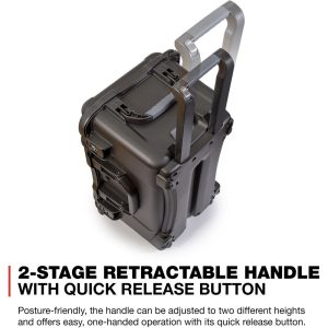 Constructed from lightweight yet impact-resistant NK-7 resin, the 975S is built to withstand demanding environments. The case is secured by seven PowerClaw latches with integrated slide locks, keeping the lid firmly closed—even if the case is dropped. Oversized team-carry side handles make lifting easier, while four smooth-rolling polyurethane wheels and a retractable handle allow for effortless transport of heavy loads.